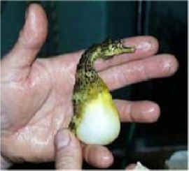 Un macho puede ser visitado por cierto número de hembras que le dejan huevos, pero si un huevo no alcanza a llegar a uno de estos departamentos, no se desarrolla. No obstante, los que caen bien, se desarrollan en esta bolsa hasta los 50 ó 60 días y eclosionan dentro ella.