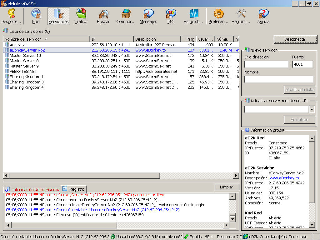 Luego, vamos pinchando en el servidor eDonkeyServer No2 todo el rato, en periodos cortos, hasta que el nombre de dicho servidor se coloree de color azul (abajo tenéis el ejemplo). En la zona de REGISTRO, podréis ver cómo intenta conectarse al servidor y va fallando (parece estar lleno), hasta que en algún intento que pinchéis, se os conectará.