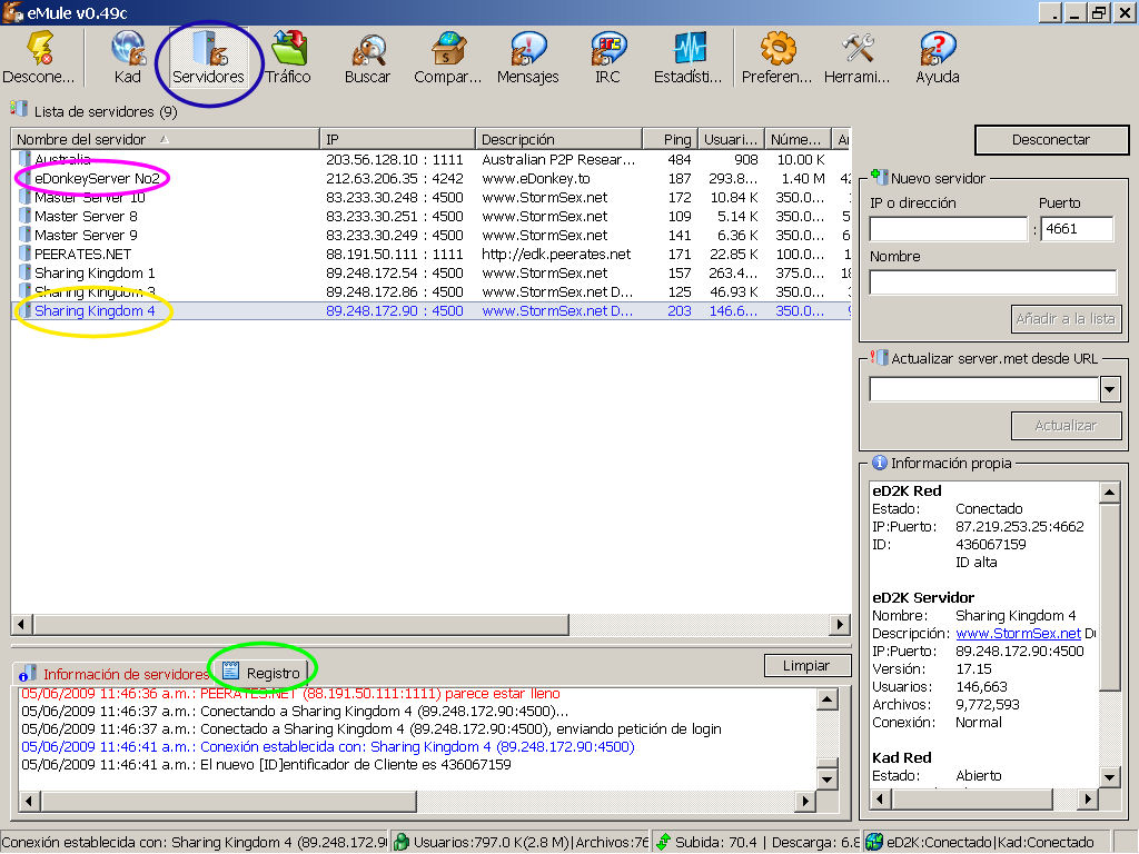 Así que cada vez que tengáis que buscar algo, aseguraos que estáis conectado en ese servidor. Mirad en la pestaña de SERVIDORES (círculo azul) y comprobad que el servidor eDonkeyServer No2 aparece de color azul. En la imagen del ejemplo de abajo, vemos el servidor eDonkeyServer No2 (círculo rosa) sin conectar y el servidor Sharing Kingdom 4 (círculo amarillo) conectado, ya que tiene el nombre en color azul.