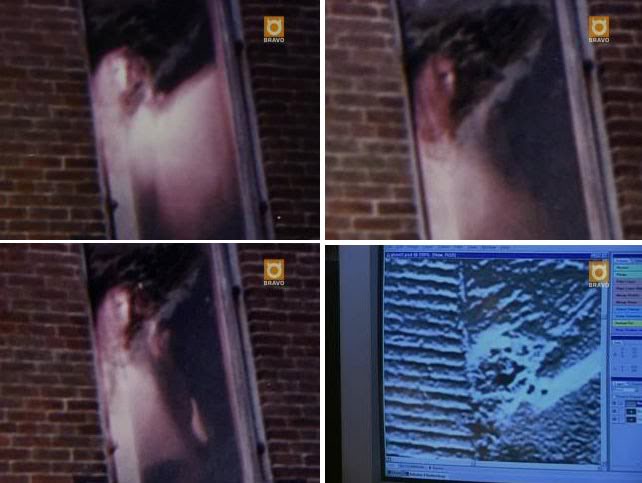 Las fotos de abajo son el resultado de las imágenes que Guy tomó de una de las ventanas de la planta de arriba. Aparece la imagen vaporosa de una mujer de rosa. Guy no vio la figura en el momento de tomar la instantánea, pero posteriormente la descubrió cuando reveló la imagen. Un análisis del carrete determinó que la imagen está presente en el negativo. La foto de la parte inferior derecha está retocada digitalmente para revelar la forma de un rostro, ya que la imagen tiene los rasgos difuminados.