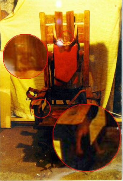 Un poco más difícil de explicar, quizás, sea la mano etérea en el reposabrazos derecho de la silla. Esto también puede ser fruto de la pareidolia, pero parece ocupar exactamente el lugar donde estaría la mano de una persona antes de ser ejecutada. ¿Podría ser el espectro de un hombre ejecutado?