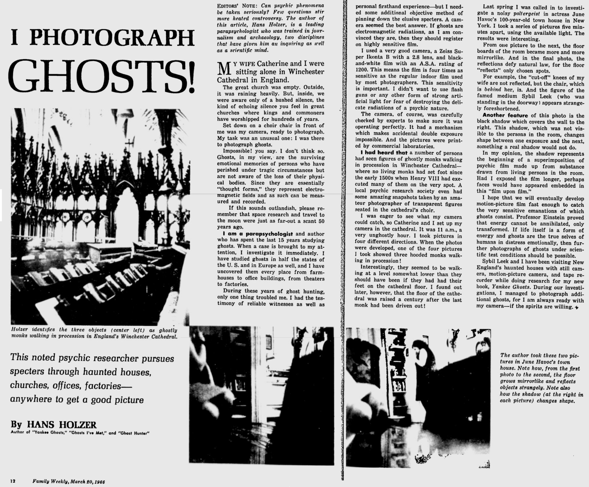 Esta imagen apareció en la edición del 20 de marzo de 1966 en la revista Family Weekly, un suplemento dominical. En ella aparecen los fantasmas de lo que parecen ser unos monjes caminando por el altar de una abadía. Se dice que muchas personas han visto fantasmas de religiosos caminando en fila en la catedral de Winchester, donde no han existido monjes viviendo desde cerca del año 1500, cuando Enrique VIII de Inglaterra ejecutó a varios de ellos.