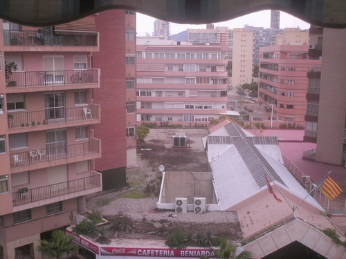 Aquí tenéis lo que se ve desde la ventana de mi cuarto. No lo presento con orgullo, pues no es una vista muy buena, aparte que vivo en una calle en la que hay mazo de ruido. Al fondo se ve un trozo de una montaña, todo un lujo ¿eh?