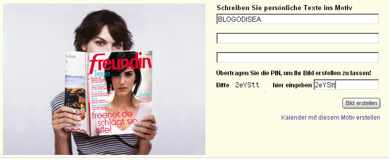 En cada imagen, vienen unos espacios o líneas para escribir el mensaje por líneas. Más abajo viene un código de verificación, que deberemos escribir en el campo hier eingeben (hay que respetar minúsculas y mayúsculas). Luego ya podremos presionar el botón de Bid erstelen para conseguir nuestra imagen dinámica.