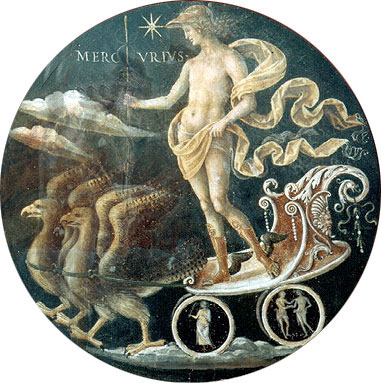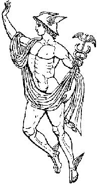 Mercurio (para los romanos) o Hermes (para los griegos), nacido en Arcadia sobre el monte Cilene, era hijo de Júpiter y de Maia (Bona Dea). El mismo día de su nacimiento se sintió ya tan apuesto y robusto que luchó contra Cupido, lo derribó con una zancadilla y le robó su carcaj. Mientras los dioses le felicitaban por su victoria, robó la espada de Marte, el tridente de Neptuno, el ceñidor de Venus y el cetro de Júpiter, y estaba a punto de escamotear el rayo si el temor de quemarse los dedos no se lo hubiera impedido.