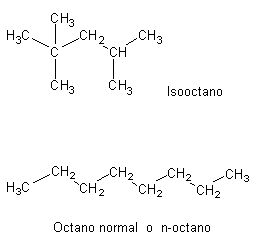 Algunas de esas moléculas, como el octano normal, se muestran en cadenas rectas de carbono. El isooctano se encuentra ramificado, como se muestra, y se considera el combustible más apreciado porque arde sin problemas.