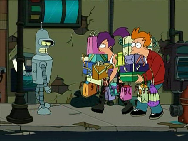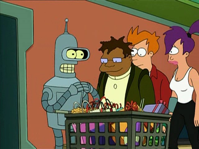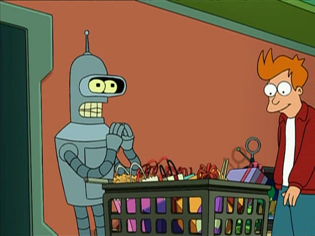 Al final, Bender convence a los tontos de Fry y Leela para que le lleven los regalos hasta la cita con la empresaria Mamá, que en el anuncio televisivo está de un falso que lo flipas diciendo que una postal es lo que deseaba XD.