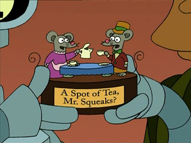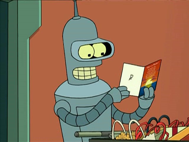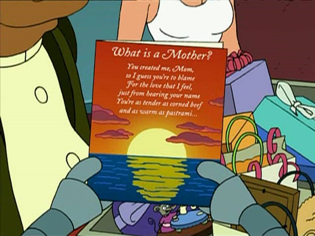 Bender le ha comprado cosas monas, como una pareja de ratones que toma el té o un marco con una foto de cuando Bender tenía un mes de vida. Y esta es la tarjeta parlanchina que también ha adquirido: “Tu me creaste mamá, y la culpa hay que echarte de todo el amor que siento cuando oigo nombrarte. Eres tierna cual ternera, y dulce cual pasta pastelera. Quiero a mi mamá”.