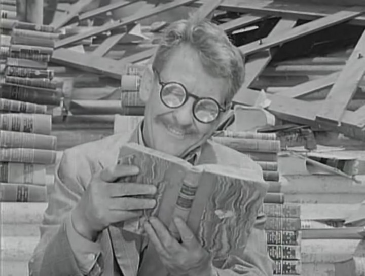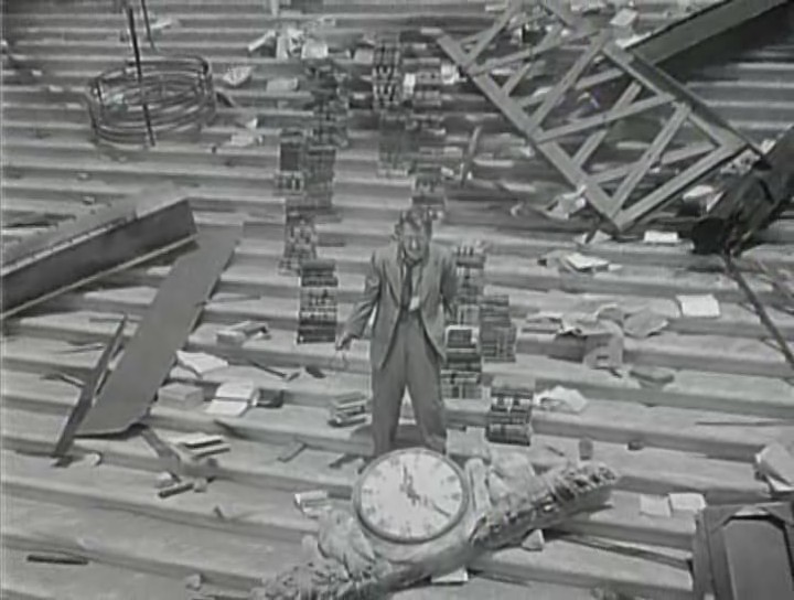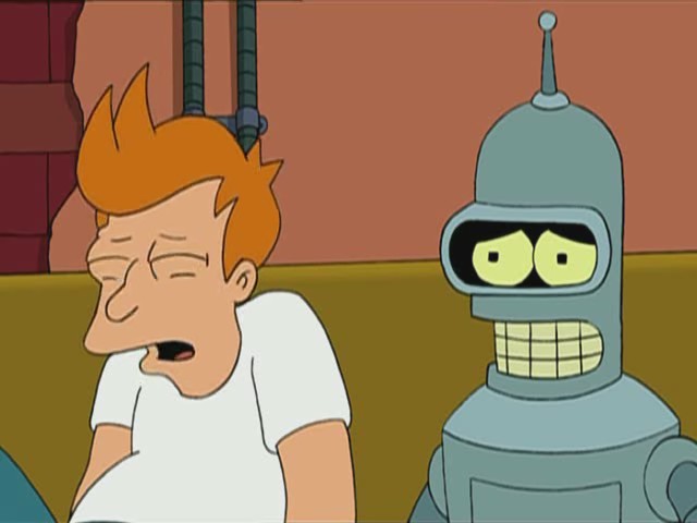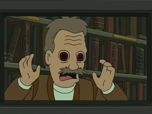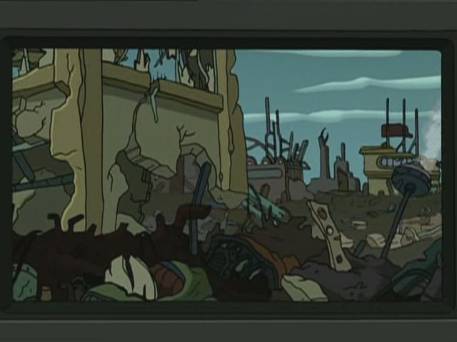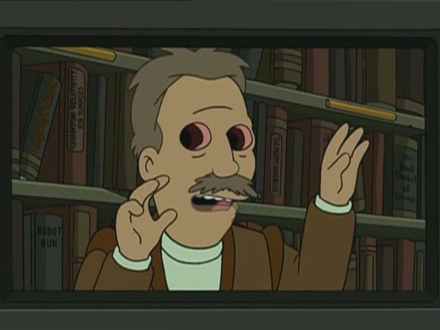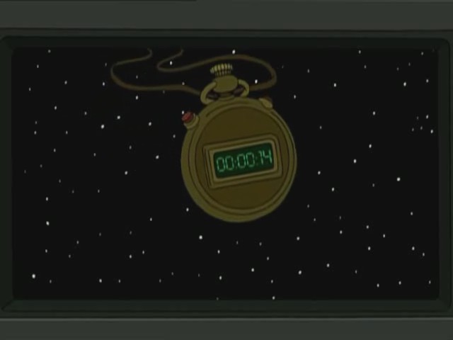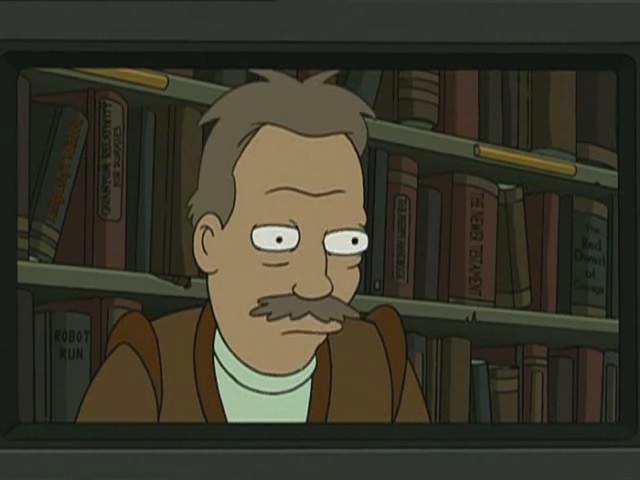 Pues bien, este programa que están viendo, pertenece a la primera serie de historias cortas y conclusivas de ciencia ficción que apareció en la tele, «La dimensión desconocida» (Twilight Zone), allá por 1959. Y concretamente, este fragmento que aparece en Futurama, pertenece al episodio 8 de la primera temporada de la serie original, «Tiempo suficiente al fin».