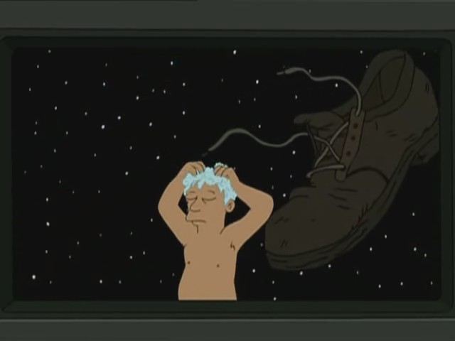 Me encanta esa alegoría a la apertura de la serie «La dimensión desconocida» que hacen en Futurama, con el hombre enjabonándose la cabeza o un muslo de pollo, referente a todos esos objetos extraños que aparecen en la inquietante apertura de la serie original, y de la cuál beberían posteriormente series como «Más allá del límite» con introducciones similares.