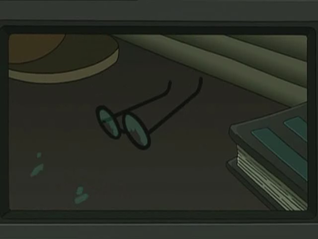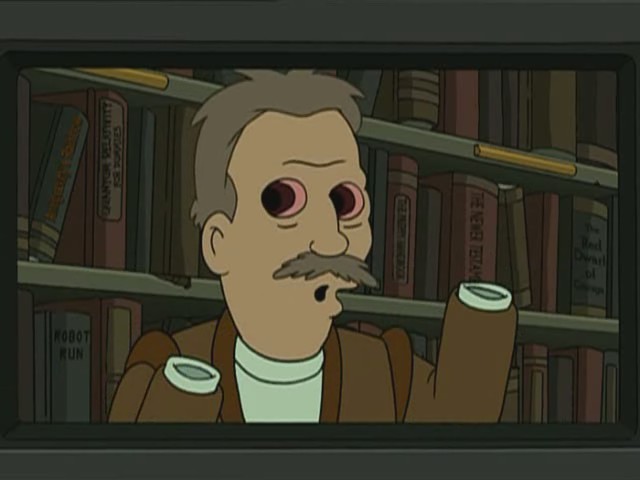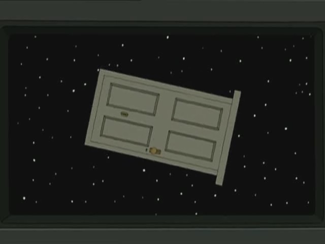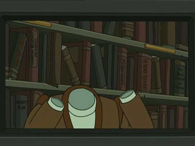Fry y Bender se hallan viendo la tele un programa de historias de ciencia ficción y suspense llamado «La puerta del terror», donde un hombre se dispone a leer en una biblioteca, pero se le caen las gafas. Aun así, dice poder leer la letra grande con sus ojos, pero igualmente se le caen. Dice de poder leer en Braille, pero se le caen las manos, y finalmente hasta la lengua y la cabeza entera.