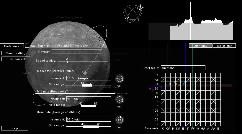 Los astrónomos japoneses de la Japan Aerospace Exploration Agency (JAXA) crearon una aplicación en la que convirteron el mapa topológico de la luna en sonidos musicales. De esa manera podemos escuchar como sonaría cualquier órbita alrededor de la misma, o desarrollar nuestro propio camino a través de la superficie de nuestro satélite… si tu sueño era pinchar la luna como si fuese un disco de vinilo, esta es tu ocasión.