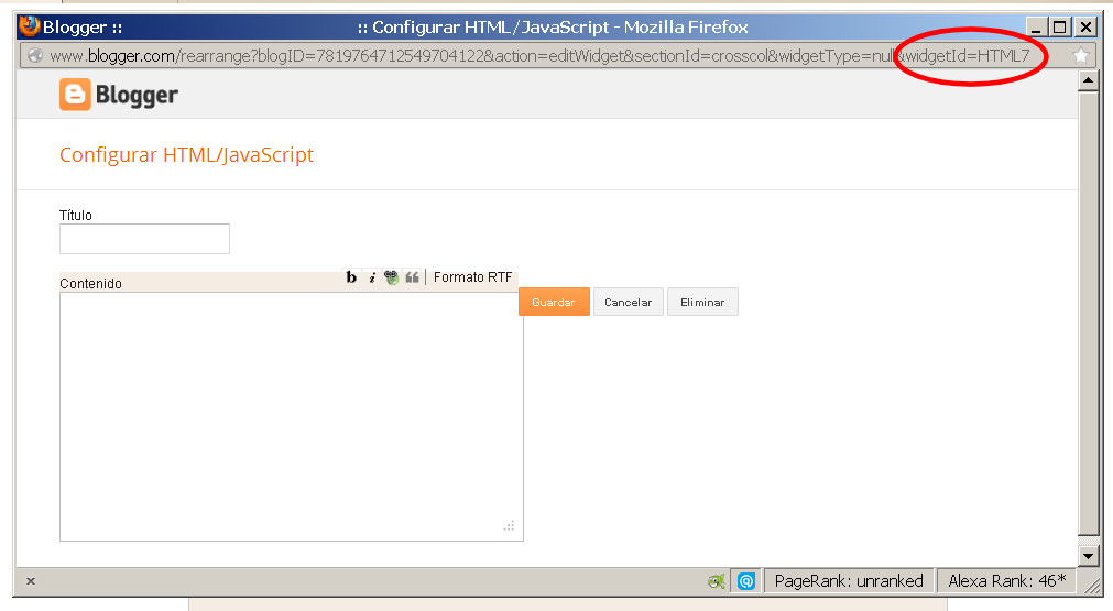 Y entre todo el código, buscamos el nombre nuestro gadget (en el ejemplo, el gadget se llamaba HTML7). Nos podemos ayudar de la opción BUSCAR que está en todos los exploradores, porque o si no, nos volveremos locos para encontrar la ID de nuestro gadget entre tanto código.