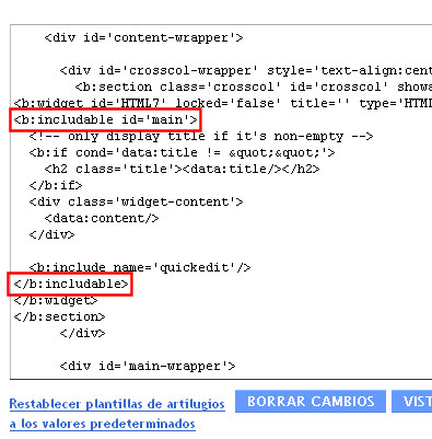Así que escribimos la apertura de la condición (<b:if cond=’data:blog.pageType == «index»‘>) tras la apertura del includable, y el cierre de la condición (</b:if>) antes del cierre del includable.