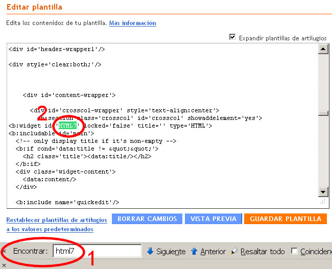 Sabiendo el nombre del gadget (en el ejemplo se llama HTML7), ya podemos localizarlo más fácilmente en la plantilla HTML. Ahora vamos a la sección DISEÑO y la pestaña EDICIÓN HTML, y marcamos la casilla EXPANDIR PLANTILLAS DE ARTILUGIO. Así podremos ver el interior de cada gadget.
