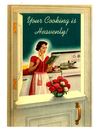 COCINERA: Que las comidas estén dispuestas a tiempo, a la hora que el señor las ha pedido. Puede tener un cita de negocios, una reunión. Si no hay nada preparado a la vuelta, ya se comprende su descontento, su impaciencia. De ahí a las escenas no hay más que un paso que pronto se franquea. Trata de cocinar bien. Los buenos maridos tienen fama de buen apetito. En todo caso, si todas las noches hay charcutería, y cada dos o tres días el mismo menú estereotipado, su humor se resentirá. (ANGEL DEL HOGAR, La intimidad conyugal, 1949).