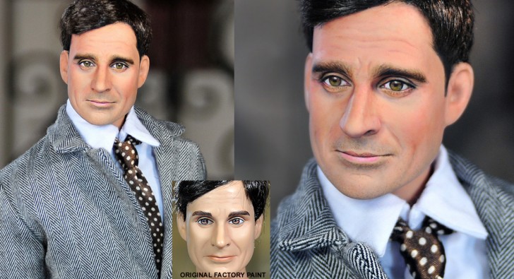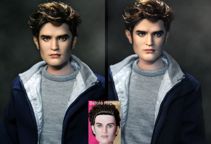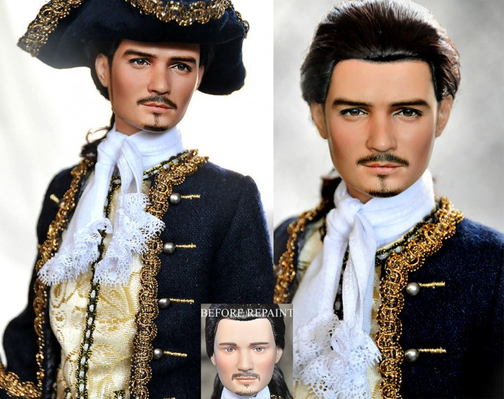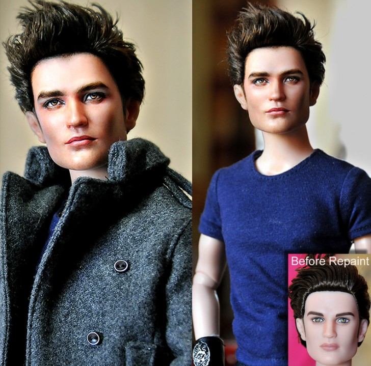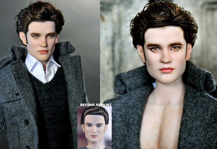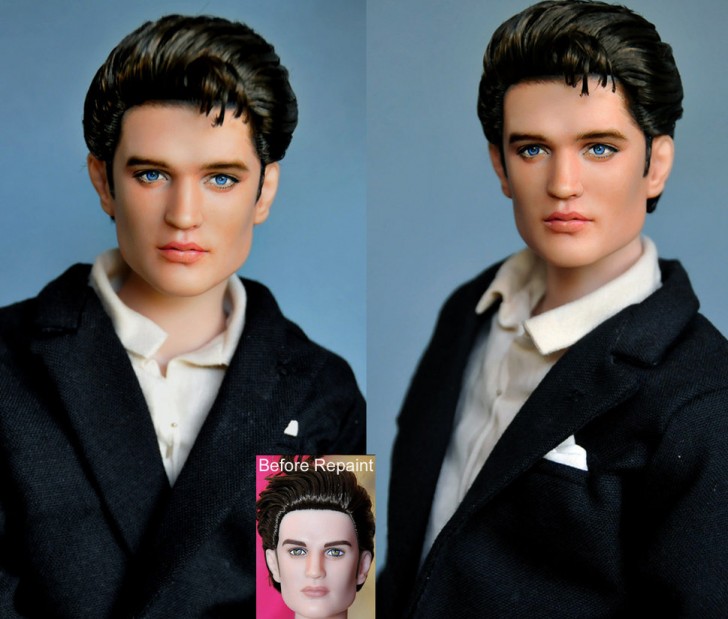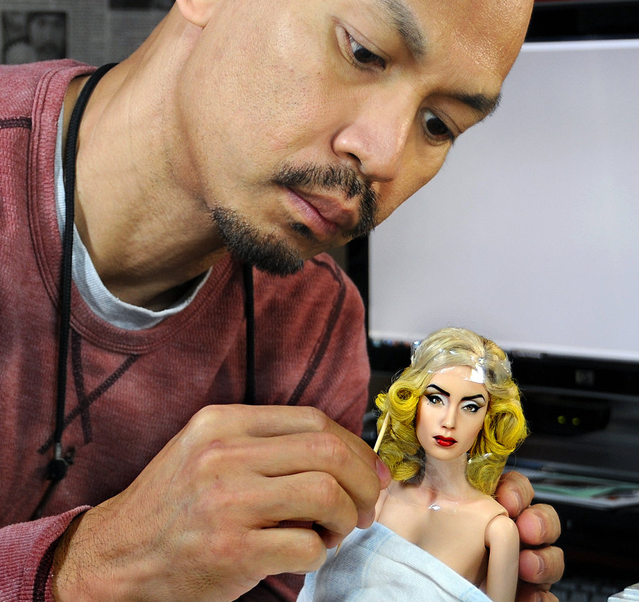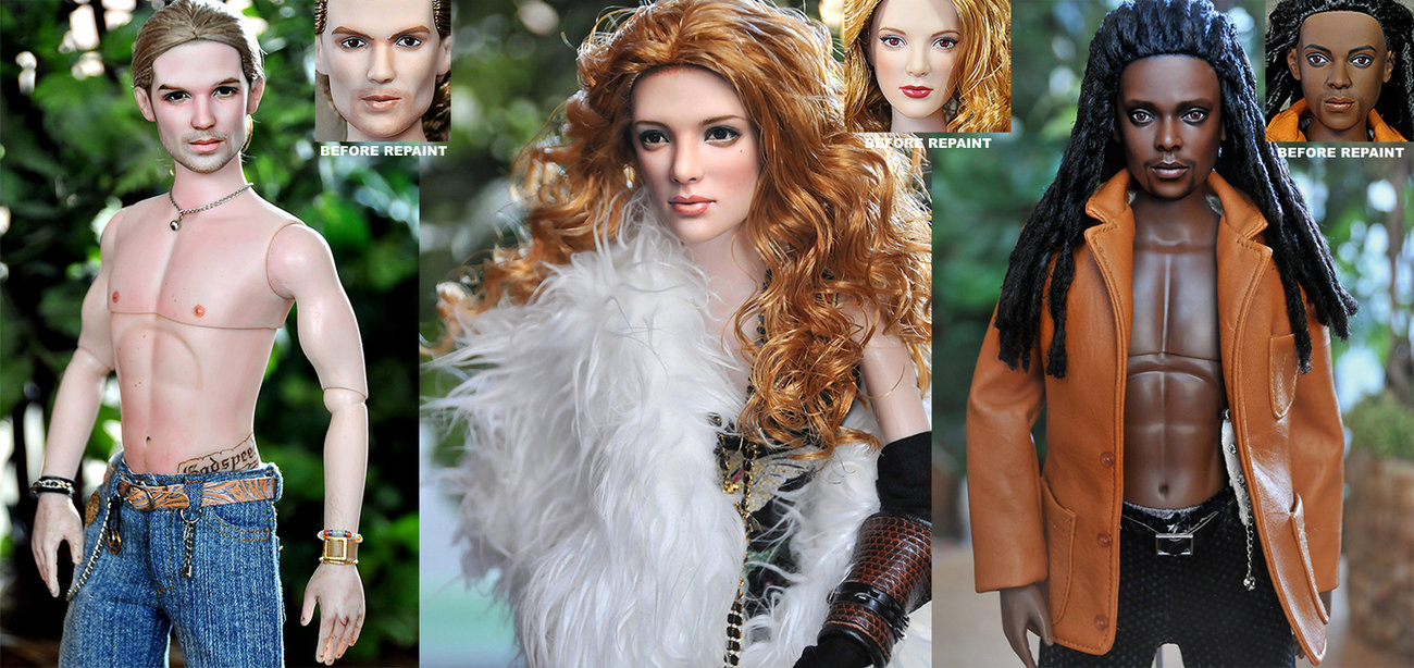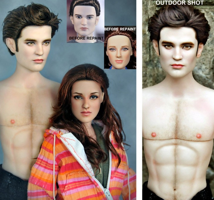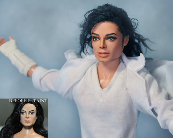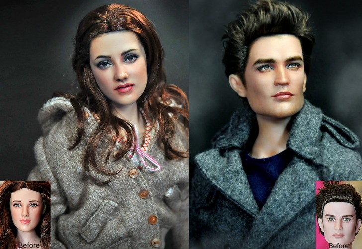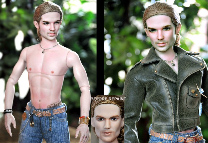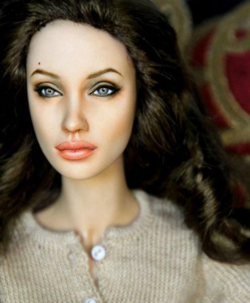 Estas muñecas de un estilo Barbie han sido creadas por el filipino Noel Cruz de 47 años. La Barbie Angelina Jolie fue subastada en Ebay por unos 2.350 euros. Para realizar estas muñecas, retira la pintura de una Barbie original (o una muñeca parecida) y la colorea empleando materiales acrílicos hasta lograr una muñeca de gran parecido a la actriz. Imagino que las recreaciones masculinas estarán desarrolladas a partir de muñecos Ken.