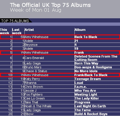 Amy Winehouse falleció el pasado sábado 23 de julio, y sorprendentemente sus discos alcanzaron los primeros puestos de las listas, al menos en Reino Unido. Esta semana Back to Black llegó al número uno, Frank al número cinco y una compilación de los dos discos al número diez.