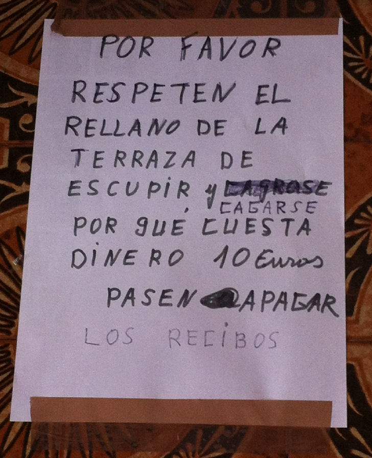 Muy bueno este cartel de una comunidad de vecinos, por decir algo, ya que viendo lo que suelen hacer en el rellano los vecinos, me pregunto si no se trata de una piara. Lo que no sé es lo que costará 10 euros, porque no sé quién realiza servicios de recoger mierdas y escupitajos de portales por ese precio. Y lo mejor es que al final de la nota, recuerda a los vecinos que pasen a pagar los recibos, no vaya a ser que se les olvide con tanto escupir y cagarse.
