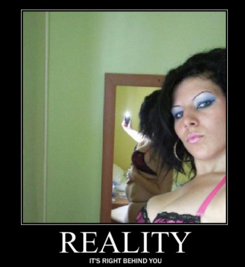 Si ya lo decía mi abuela, «no te fíes de las fotos que te manden por Internet, que están siempre retocadas con Photoshop». Pero claro, si no manejas muy bien esos programas, lo mejor que puedes hacer es realizar la foto en un ángulo adecuado. Lo malo es que no te des cuenta que los espejos son muy traicioneros. Como dice la imagen: «La realidad está detrás de ti».