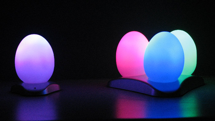 ¿Qué tienen de especial? Pues que estos huevos de agradable y suave tacto, llevan unos leds en su interior que emiten luz, la cual va cambiando y se alterna entre rojo, azul, verde y sus estados intermedios. Cada huevo tiene una duración en la transición de colores diferente, así la amalgama de tonos es muy surtida si los tenemos juntos.