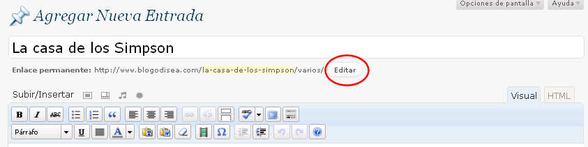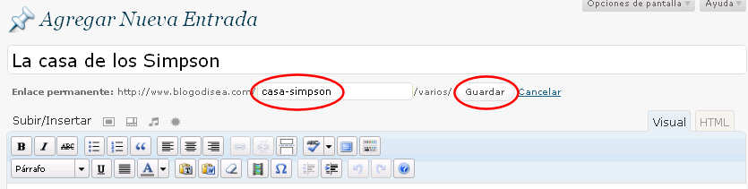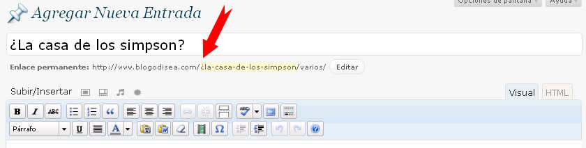 Primeramente, se desaconsejan las URL excesivamente largas, así que siempre podremos retocar las URL en el campo de ENLACE PERMANENTE que tenemos debajo del título de la entrada. En la imagen de abajo, podéis ver coloreado de amarillo, la URL que definió WordPress al escribir el título de la entrada. En el ejemplo: la-casa-de-los-simpson