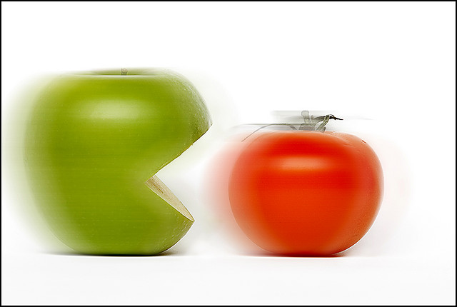 Pac-Manzana dispuesto zamparse un tomate. Foto tomada en una tarde de aburrimiento.