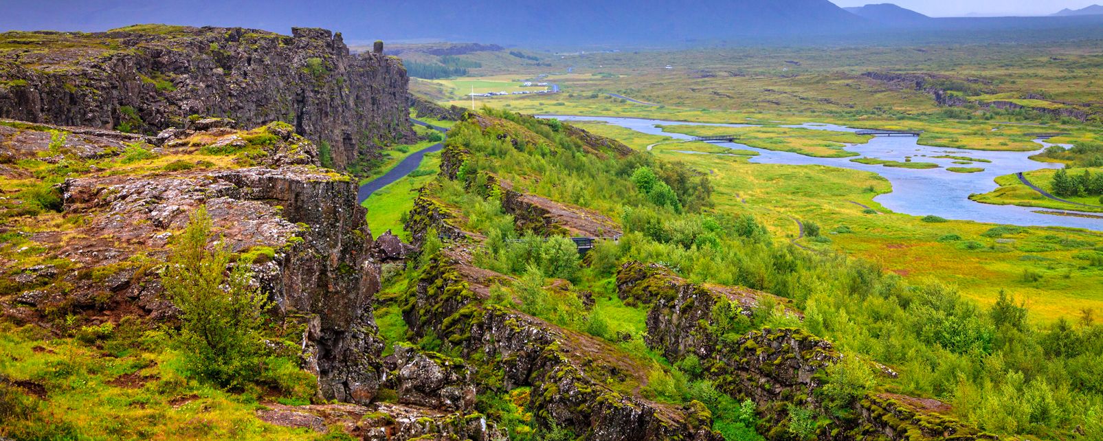 La ruta se adentra en el centro de la isla y se realizan tres paradas principales. La primera es Þingvellir, un valle en el sureste de Islandia, cerca de la península de Reykjanes.