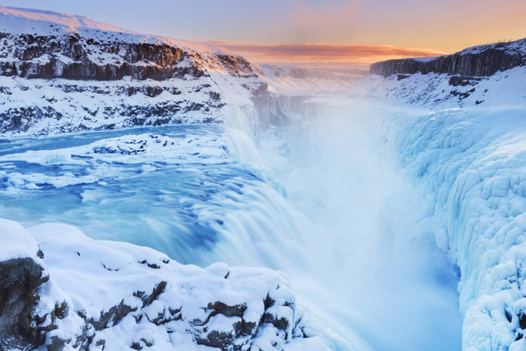 La cascada Gullfoss es otro de los lugares más populares de Islandia. El río Olfusa fluye por aquí descendiendo por una ancha cascada de tres escalones de 32 metros de altura. La grieta donde desemboca posee unos 20 metros de envergadura y 2,5 kilómetros de longitud. A veces y según las perspectiva, el final de la cascada está oculto a la vista, pareciendo que el río desaparece mientras cae al interior de la tierra.