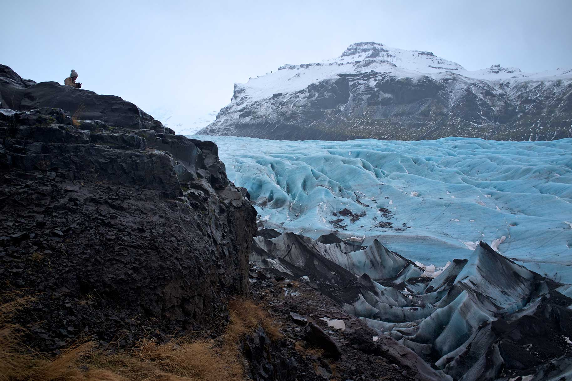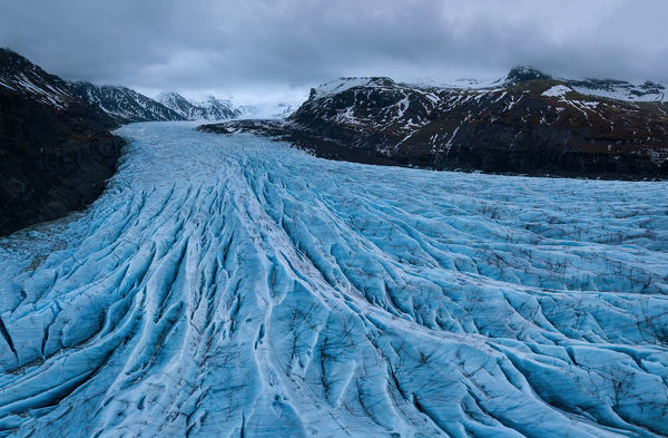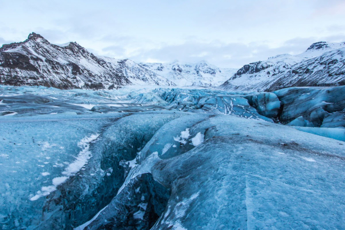 La lengua glaciar Svínafellsjökull, parte del glaciar Vatnajökull, parece el escenario de un mar helado. Algunas veces está cubierto de cenizas volcánicas, pero si tenemos suerte, lo encontraremos en todo su esplendor, cuando el hielo azul está cubierto de nieve.