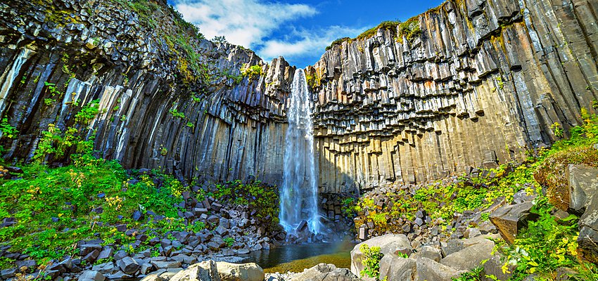 Dentro del Parque Nacional de Skaftafell, una de las mayores atracciones es la cascada Svartifoss, cuya caída está enmarcada por unas columnas basálticas negras de origen volcánico.