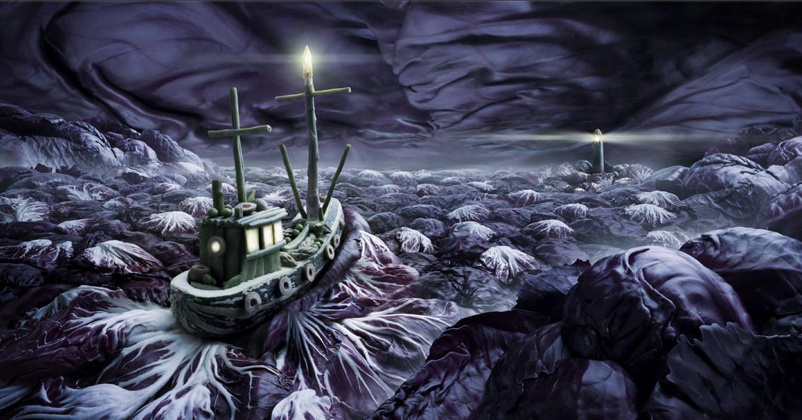 Los árboles están hecho con hojas de col, las piedras con patatas rojas, el desfiladero con pan y el cielo con col lombarda.