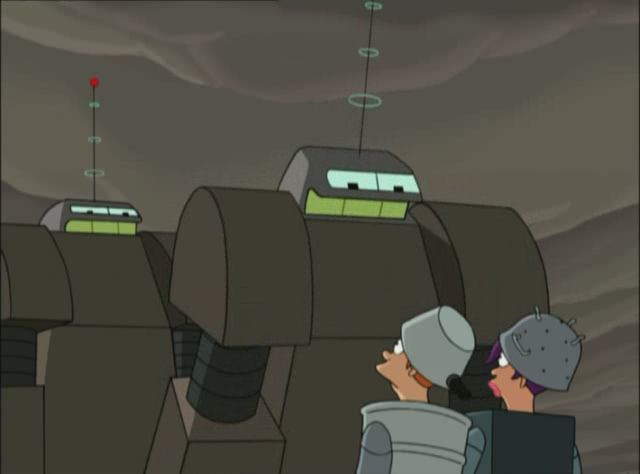 Este trozo rememora el punto donde deben franquear la entrada a la ciudadela robot y los robots guardias obsequian a nuestros protagonistas con una pregunta-acertijo-prueba de pase. Entre lo que deben elegir Fry y Leela es: