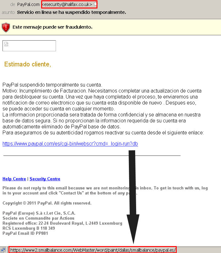 Si el correo era de Paypal, lo normal sería que el enlace de abajo dirigiese realmente a paypal.com, pero como muestro en la imagen, dirigía a otra web. Otro de los puntos en que reparé posteriormente, es que la dirección de correo que enviaba el mensaje tampoco era de Paypal, sino de algo de «halifax».