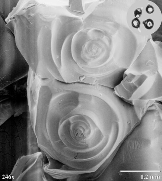 Granizo mostrado por la mitad. Se puede observar su estructura y las diferentes capas de hielo que se fueron formando sobre su primer núcleo.