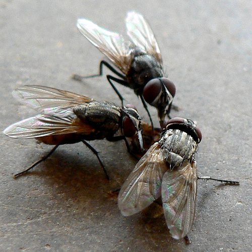 Su amor por las cosas descompuestas, deriva en que estas moscas sólo pueden ingerir comida en estado líquido o semi-líquido. Suelen impregnar la comida con una saliva que descompone el alimento, que posteriormente succionarán.