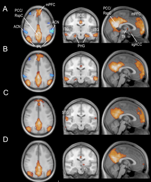 Los cambios en las redes neuronales fueron examinados dinámicamente en periodos de 26 minutos. Expansión del «sistema de modo por defecto» (en rojo) y la red anticorrelacionada (ACN, en azul) durante cuatro estados de vigilancia: A: estado de vigilia, B: estado de sueño 1, C: estado de sueño 2, D: sueño profundo. La parte prefrontal (el lóbulo prefrontal medio mPFC) pierde las conexiones a la red neuronal de manera especial. La red anticorrelacionada se debilita durante el estado de sueño 1, mientras que en el estado de sueño 2 no se detecta.