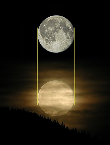 Otra causa es física, en este caso la refracción. Cuando nuestro satélite está en el horizonte, los rayos de luz se desvían notablemente gracias a que el aire es más denso cerca de la superficie y porque el espesor del aire que tienen que atravesar es mayor. Lo más curioso es que podemos seguir viendo la Luna después de haberse puesto porque la refracción sube ligeramente su imagen por encima de su posición real.
