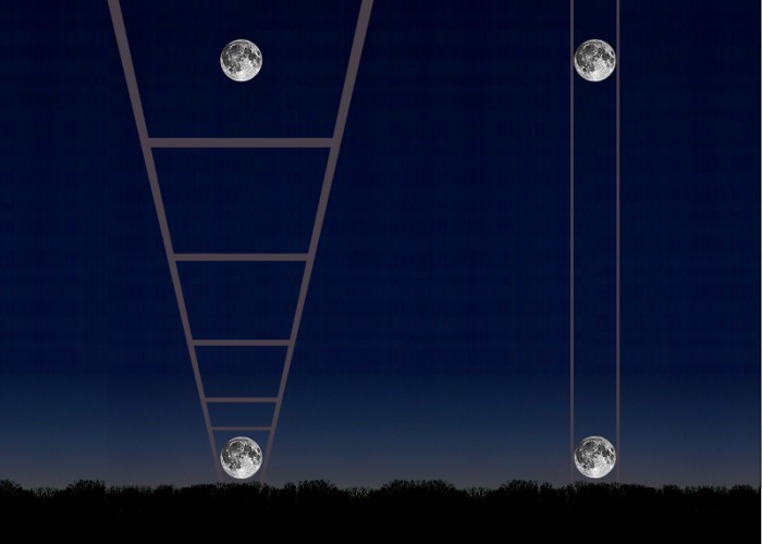 La segunda manera se fundamenta en cómo observamos al cielo: aunque en realidad sepamos que la Luna, el Sol y las estrellas están a millones de kilómetros de nosotros, nuestro cerebro se siente más cómodo pensando en una distancia determinada y percibimos el cielo como una bóveda en la cual la Luna, el Sol y las estrellas parecen estar a la misma distancia.