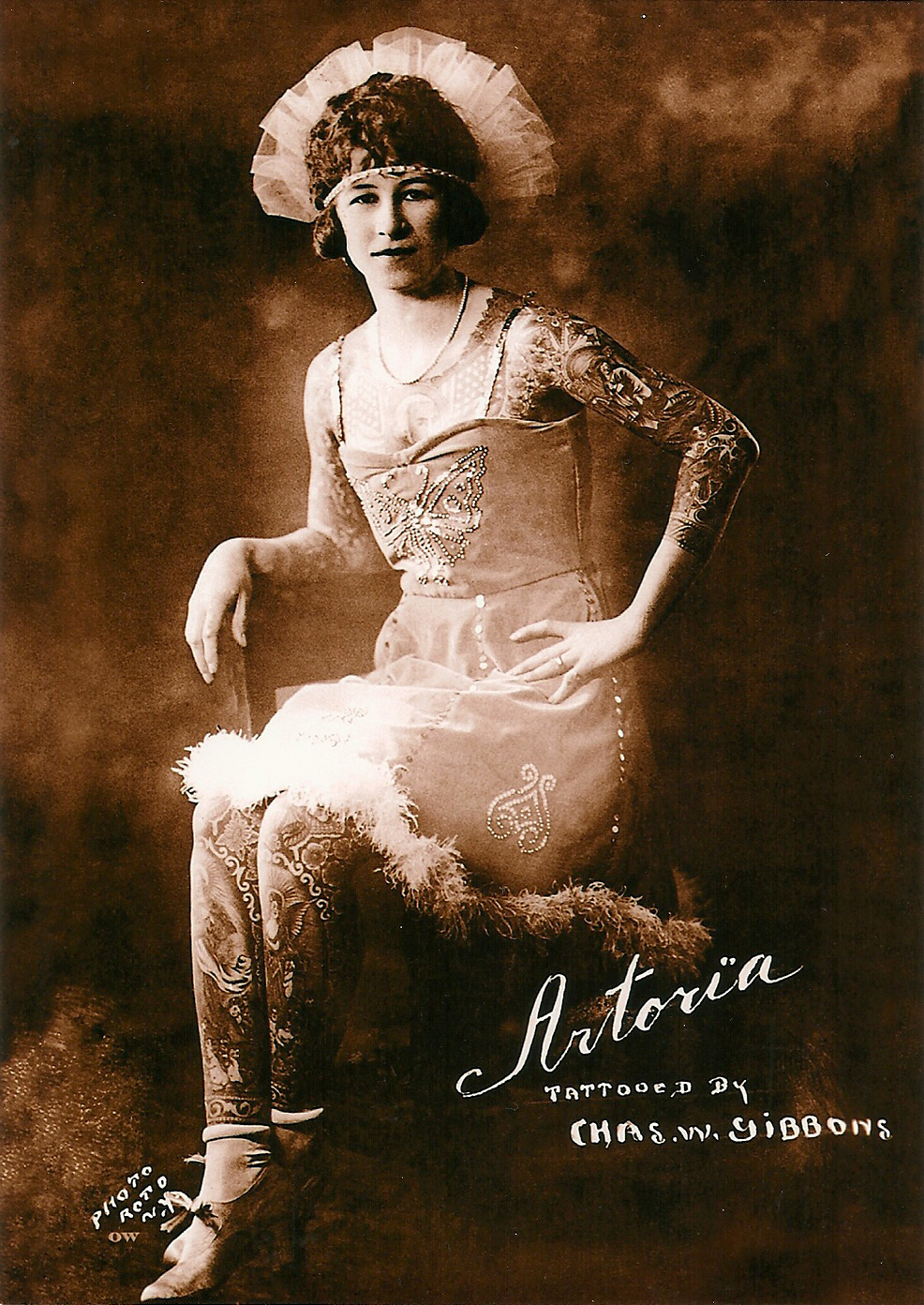 Artoria Gibbons nació con el nombre real de Anna Mae Burlingston el 16 de julio de 1893 en Linwood, Wisconsin, y más tarde se mudó a Washington con su familia. Anna provenía de una familia pobre y trabajó como sirviente doméstica en Spokane, Washington. Allí conoció al artista tatuador Charles (Red) Gibbons, con quien se casó en 1912. Su marido tatuó todo su cuerpo con motivos religiosos, ya que Anna era una mujer muy devota y miembro de la iglesia episcopal. Junto a su marido trabajó como mujer tatuada en la década de 1920 bajo el nombre artístico de Artoria Gibbons, y cuando no estaban viajando, vivían en California. Entre sus tatuajes estaban La Anunciación de Sandro Botticelli, La Sagrada Familia de Miguel Ángel y en su pecho figuraba un retrato de George Washington.