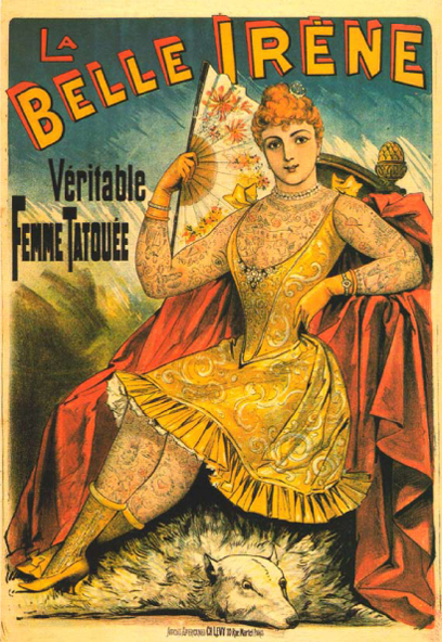 Irene Woodward, también conocida como La Belle Irene, nació en 1862 y empezó a realizar actuaciones como mujer tatuada durante la década de 1880. Realizó su debut por todo lo alto en Nueva York unas semanas después que Nora Hildebrandt, consiguiendo una reseña en el New York Times. Trabajó en el museo Bunnell y realizó viajes por toda Europa con gran éxito. En el escenario reivindicaba haber sido tatuada por su padre, aunque realmente fue tatuada por Samuel O’Reilly y su entonces aprendiz Charles Wagner. A veces, decía haber sido inspirada al haber visto al príncipe Constantine. En 1883 se casó con el hombre de negocios George E. Sterling, con el que tuvo un hijo llamado también George, y pasó 15 años en el circo. Irene murió en diciembre de 1915 en Filadelfia, Pennsylvania, a la edad de 53 años.