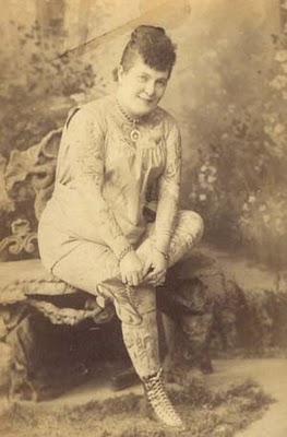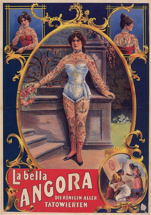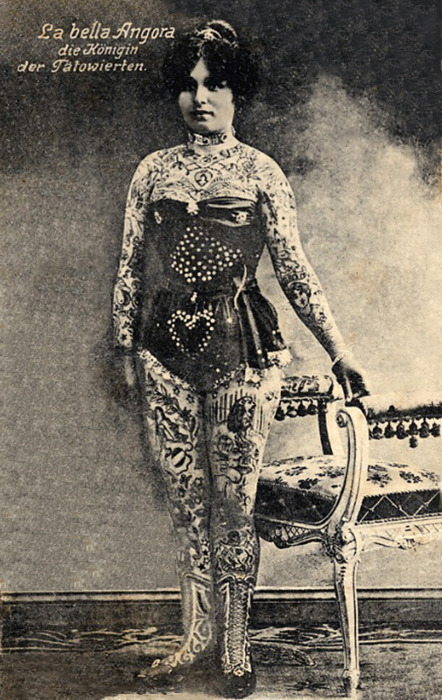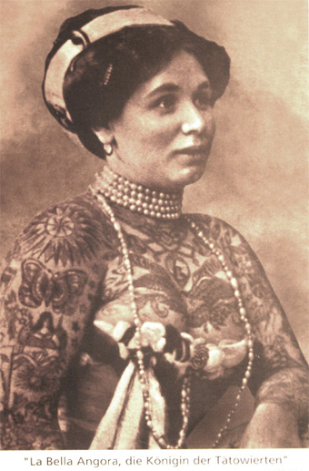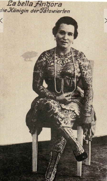La Bella Angora fue una artista circense alemana que trabajó a comienzos del siglo XX alcanzando una gran fama. Como muchas otras mujeres, también contó truculentas historias para explicar el origen de sus tatuajes, que le fueron grabados cuando fue apresada por la fuerza en tierras lejanas por unos salvajes.