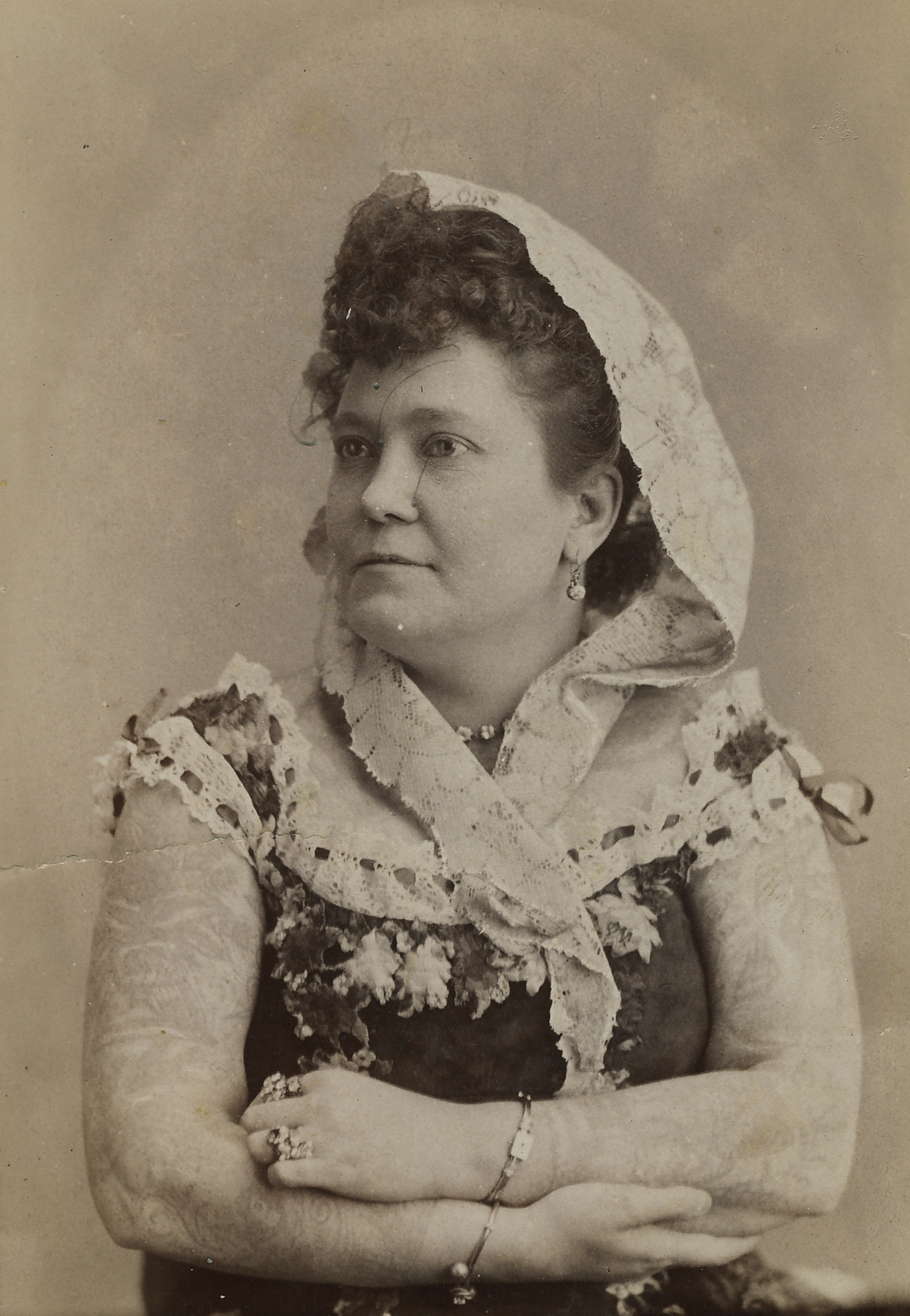 Nora Hildebrandt nació en 1857 y fue la primera mujer tatuada en ser una atracción de circo. Realizó su debut en el museo Bunnell de Nueva York el 1 de marzo de 1882. Como muchas otras mujeres tatuadas de aquella época temprana, Nora dijo que los indios de Toro Sentado le habían tatuado a la fuerza cuando fue cautiva por orden del jefe nativo. Contaba que fue tatuada diariamente durante un año mientras la ataban a un árbol. Nora fue tatuada realmente en Nueva York por su padre, el alemán Martin Hildebrandt, uno de los primeros hombres en montar una tienda de tatuajes en Estados Unidos, concretamente en 1846. Semanas después de su debut, otra mujer tatuada, Irene Woodward, entró en escena y consiguió eclipsar a Nora.
