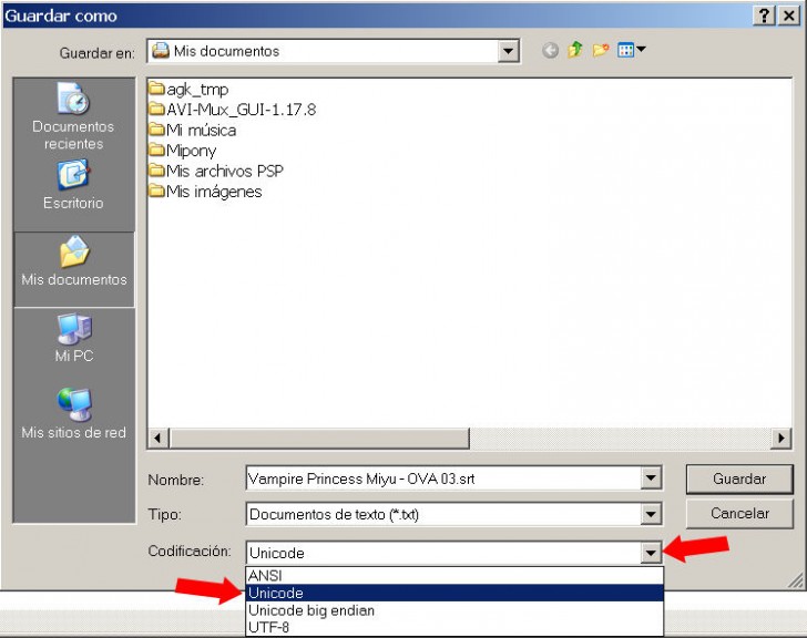 Ahora escogemos en la sección de codificación la opción UNICODE.