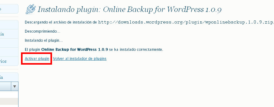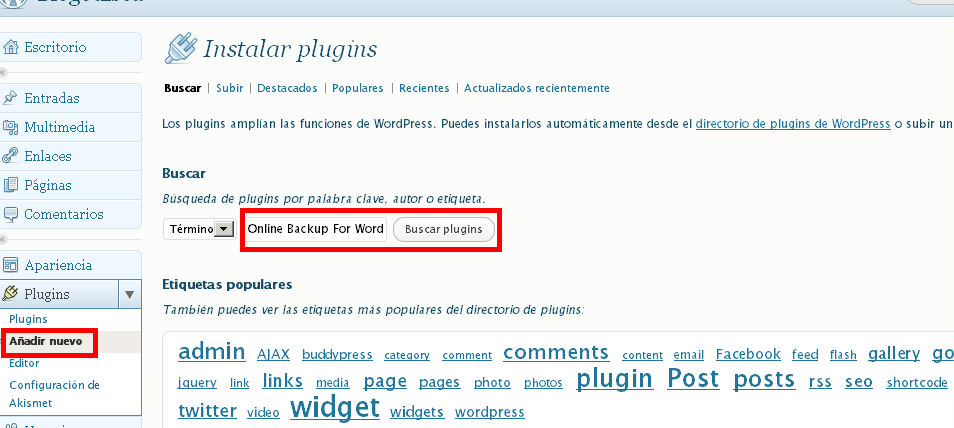 El plugin se llama Online Backup For WordPress. Podemos descargarlo aquí o bien bajarlo desde el gestor de añadir plugins nuevos, escribiendo «Online Backup For WordPress» para realizar la búsqueda.