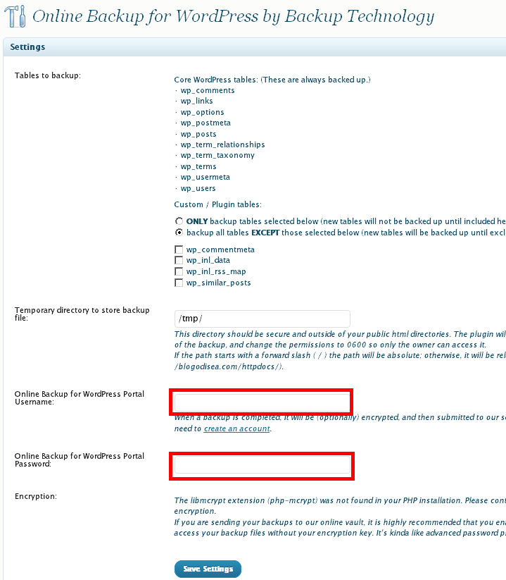 Aquí debemos escoger las tablas que queremos incluir o no en cada copia y debemos insertar el nombre de usuario (USERNAME) y contraseña (PASSWORD) con que nos registramos en la página del plugin anteriormente.