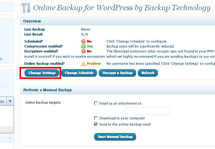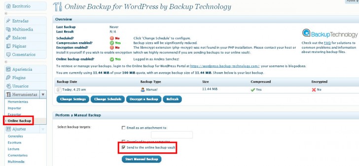 Para configurar el plugin en WordPress tenemos que ir a HERRAMIENTAS > ONLINE BACKUP y señalamos la opción SEND TO THE ONLINE BACKUP VAULT.