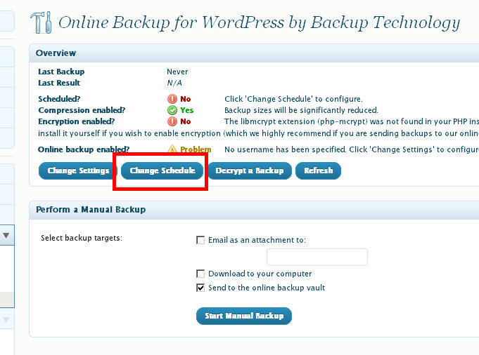 En CHANGE SCHEDULE podemos configurar cada cuanto tiempo queremos generar y enviar las copias automáticas.