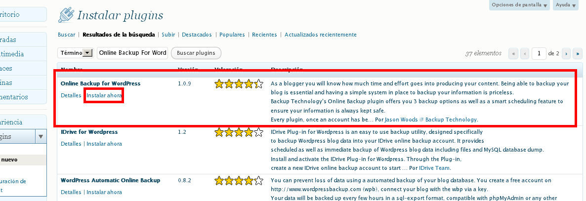 Escogemos el plugin con el nombre correcto (el primer resultado de arriba seguramente) y lo instalamos.