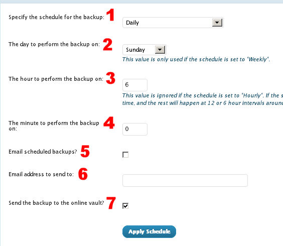 7 – SEND BACKUP TO THE ONLINE VAULT?: esta opción debe marcarse para guardar las copias de las bases de datos en el servicio de alojamiento gratuito que hay en la página del plugin. Con esta opción programaremos y guardaremos las bases de datos de manera externa y segura, para mi es la opción ideal (mejor que por email).